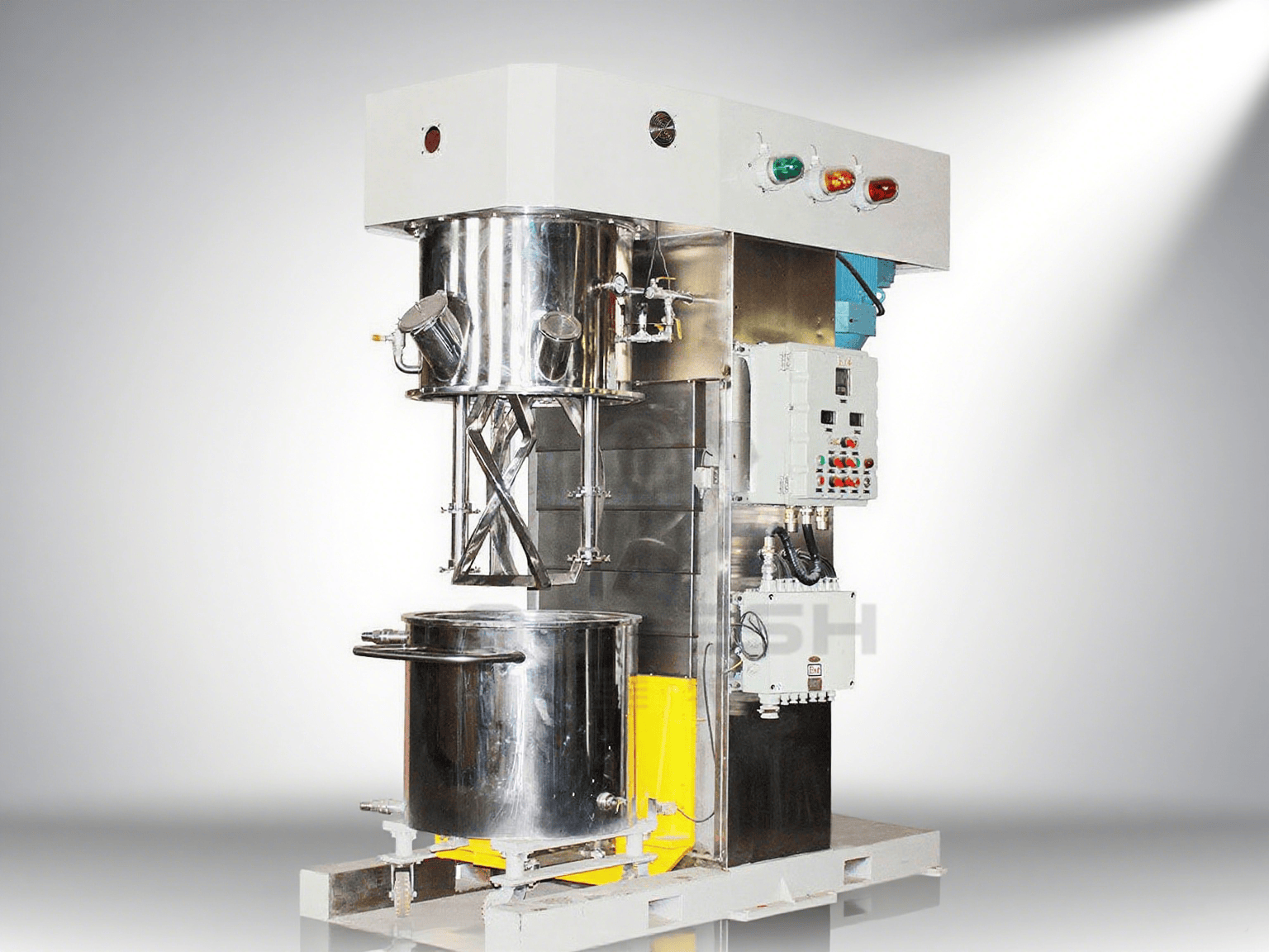 雙行星攪拌機雙行星混合機的攪拌槳葉,在公轉的同時也自轉,使罐體內物料上下及四周循環運動,從而可在很短時間內達到混合(混煉)效果。罐體內壁為大型立車精加工,再經大型拋光機自動 -